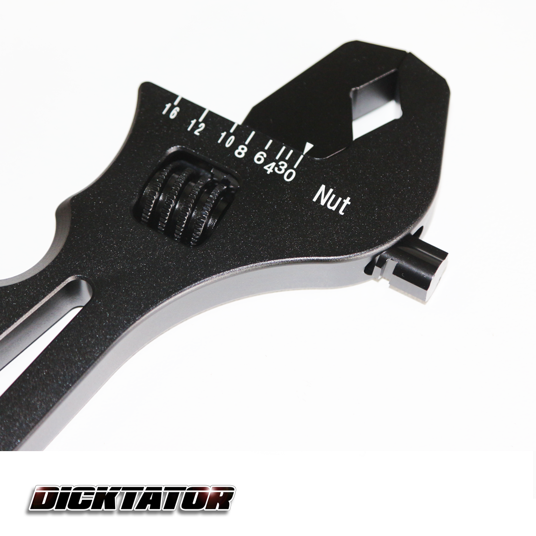 Tired of having to run to your toolbox multiple times to get the proper AN wrench? Our AN adjustable wrench is CNC machined from aluminum and features a precision mechanism with a Steel Nickel knurled thumbwheel. The handle has chamfered edges that fit comfortably in your hand. Quick size adjustment make it ideal for use in the pit area, staging lanes, or back at the shop. Fits AN -3 to -12 hose ends.